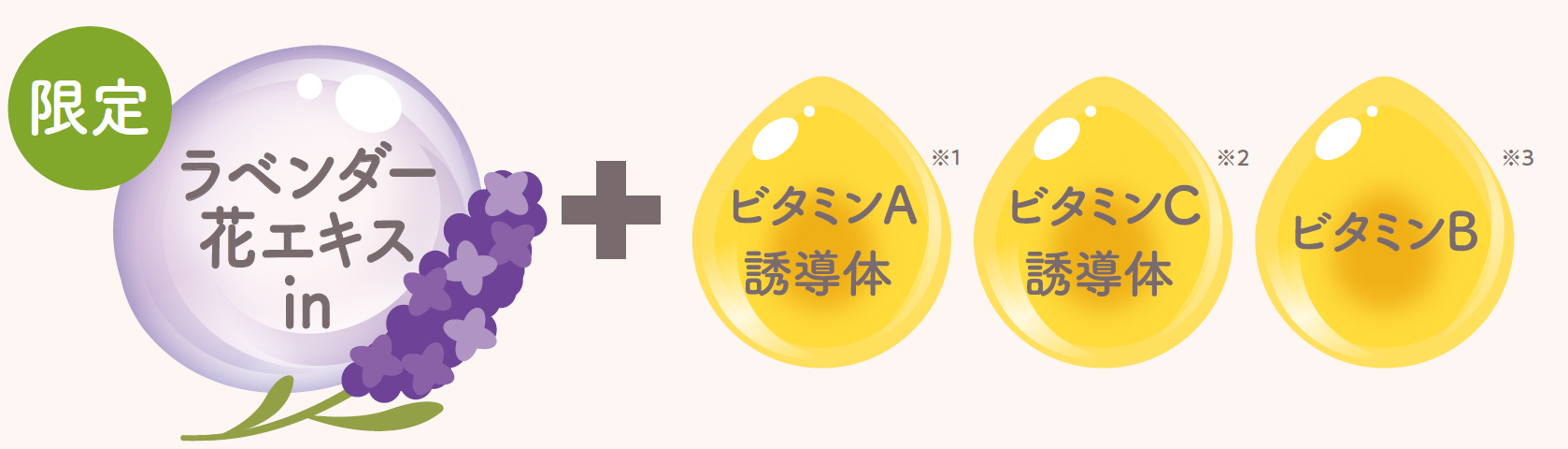 (1) ラベンダー花エキス配合!限定品だけのラベンダー花エキス(保湿成分)を含む、うるうるスキンケア成分配合。