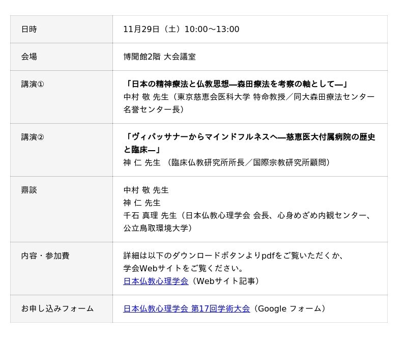 11月29日(土) の日本仏教心理学会第17回学術大会の開催にともない、講演会を実施します。