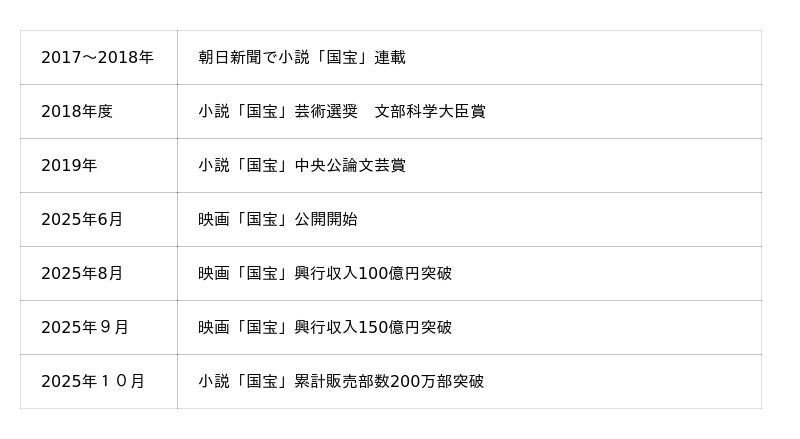 『国宝』は緻密な描写と深い人間ドラマが高く評価され、芸術選奨文部科学大臣賞(2018年)、中央公論文芸賞(19年)をダブル受賞し、日本文学の伝統に脈々と流れる芸道小説の金字塔にして、『悪人』などと並ぶ著者の最高傑作との声もあがっています。とはいえ、累計発行部数200万部超というのは出版業界でも驚きを持って受け止められています。