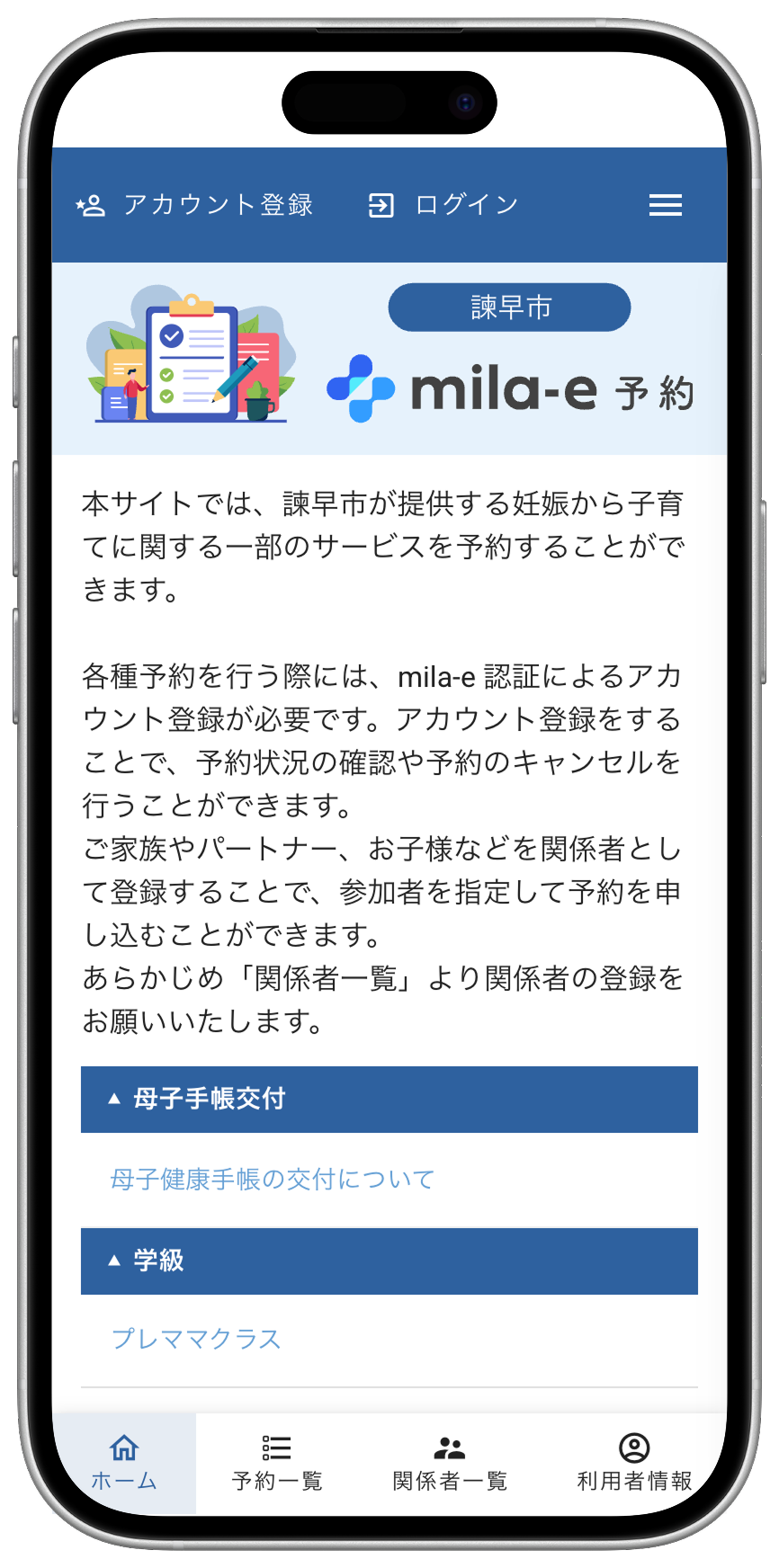 mila-e おやこ手帳 TOP画面の「各種予約」からアクセス後、お持ちのmila-e 認証アカウントにてログイン、利用者情報を入力し予約を行ってください。