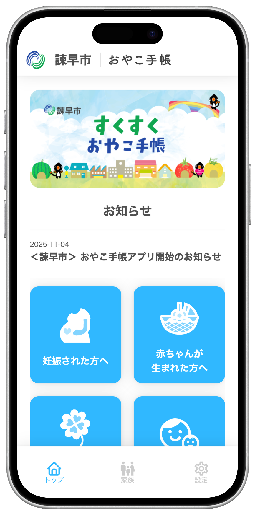 諫早市からのお知らせを月齢・年齢にあわせてタイムリーに受信できる「メール配信・プッシュ機能」、予防接種漏れや接種間隔ミスを防ぐことができる「予防接種AIスケジューラー」、成長グラフや乳幼児健診の記録など母子手帳の内容をマイページに記録できる「電子母子健康手帳 機能」などの機能をご利用いただけます。