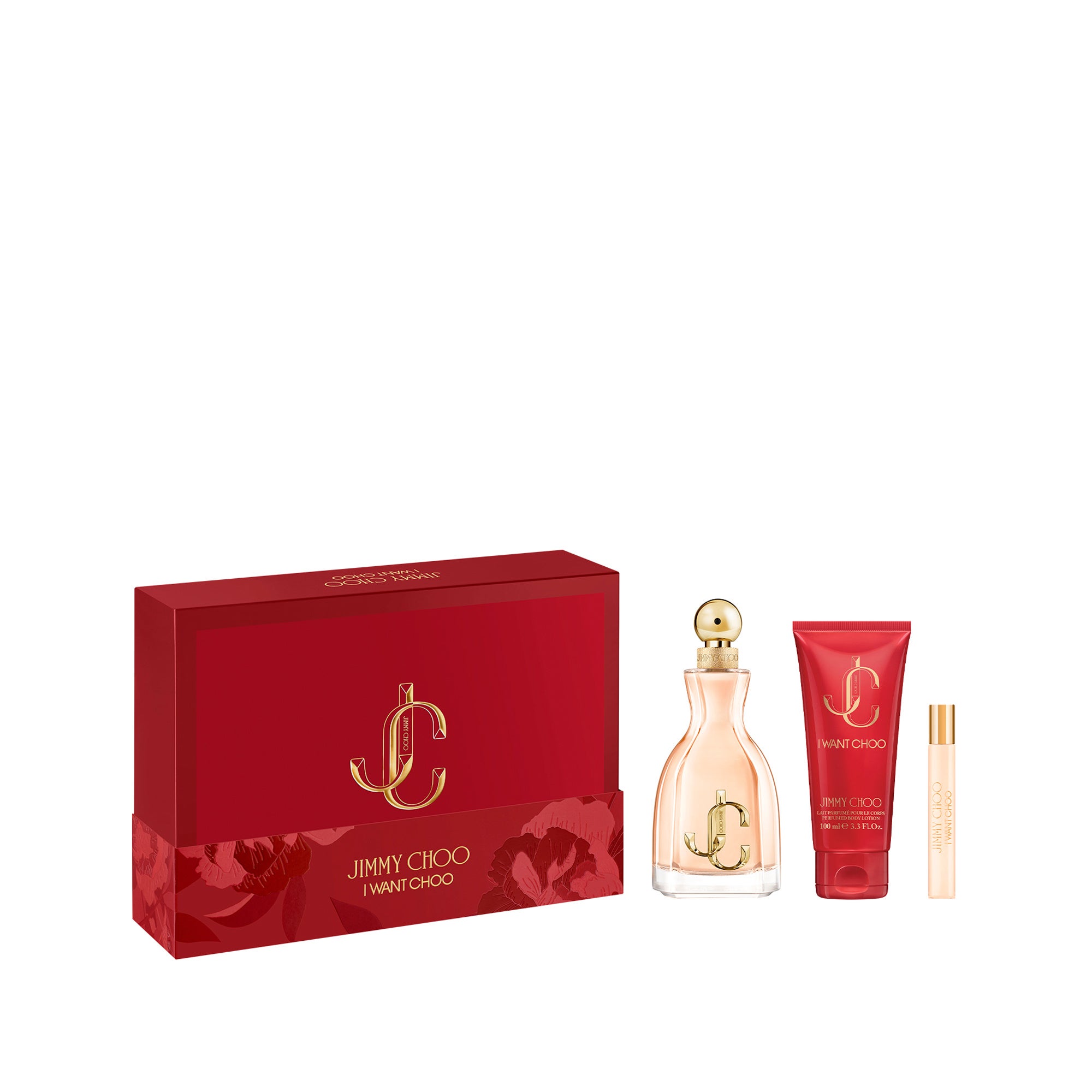華やかなレッドのギフトボックスに、ジミー チュウ アイ・ウォント・チュウ オードパルファム現品と、ミニバッグにも携帯しやすいパーススプレー、同じ香りのボディローションが入った豪華なセット。