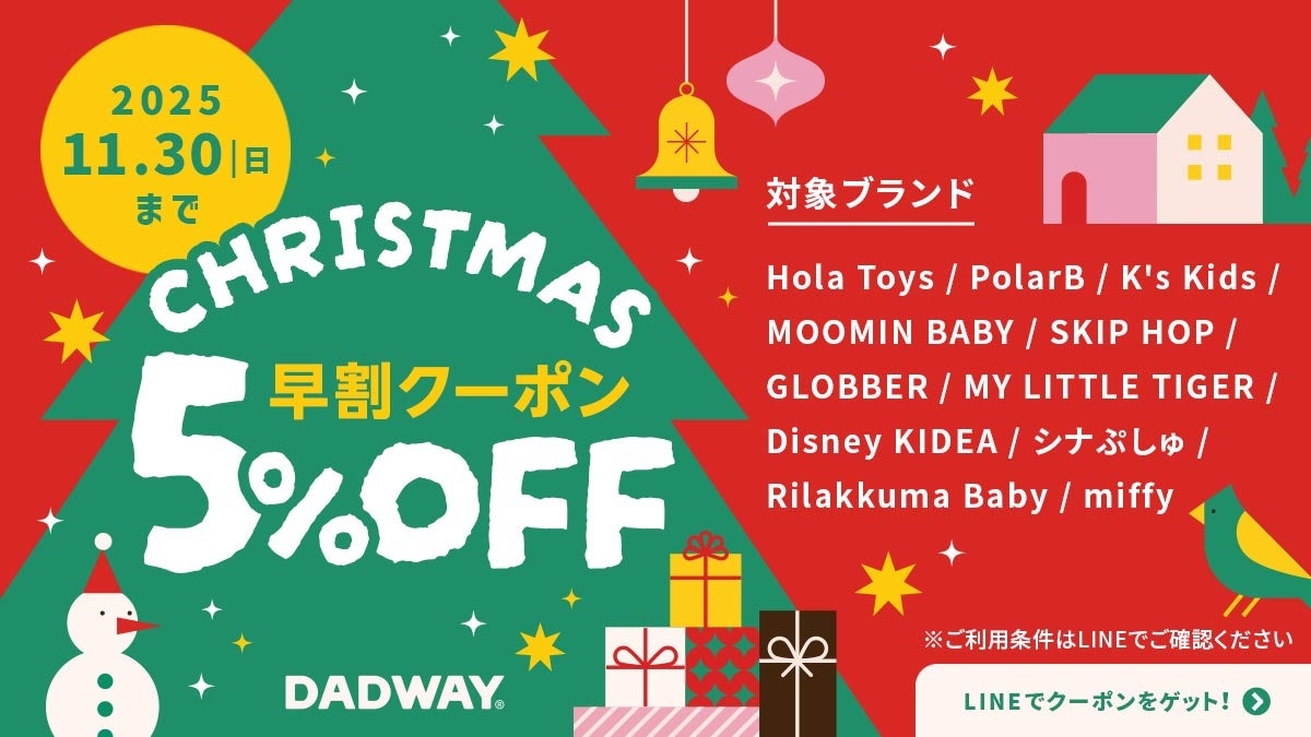 DADWAYのLINEお友だち限定で、5%OFFクーポンをプレゼント。11/1(土)~11/30(日)の期間中に使用可能。新規登録いただいた方にもクーポンを発行します。
