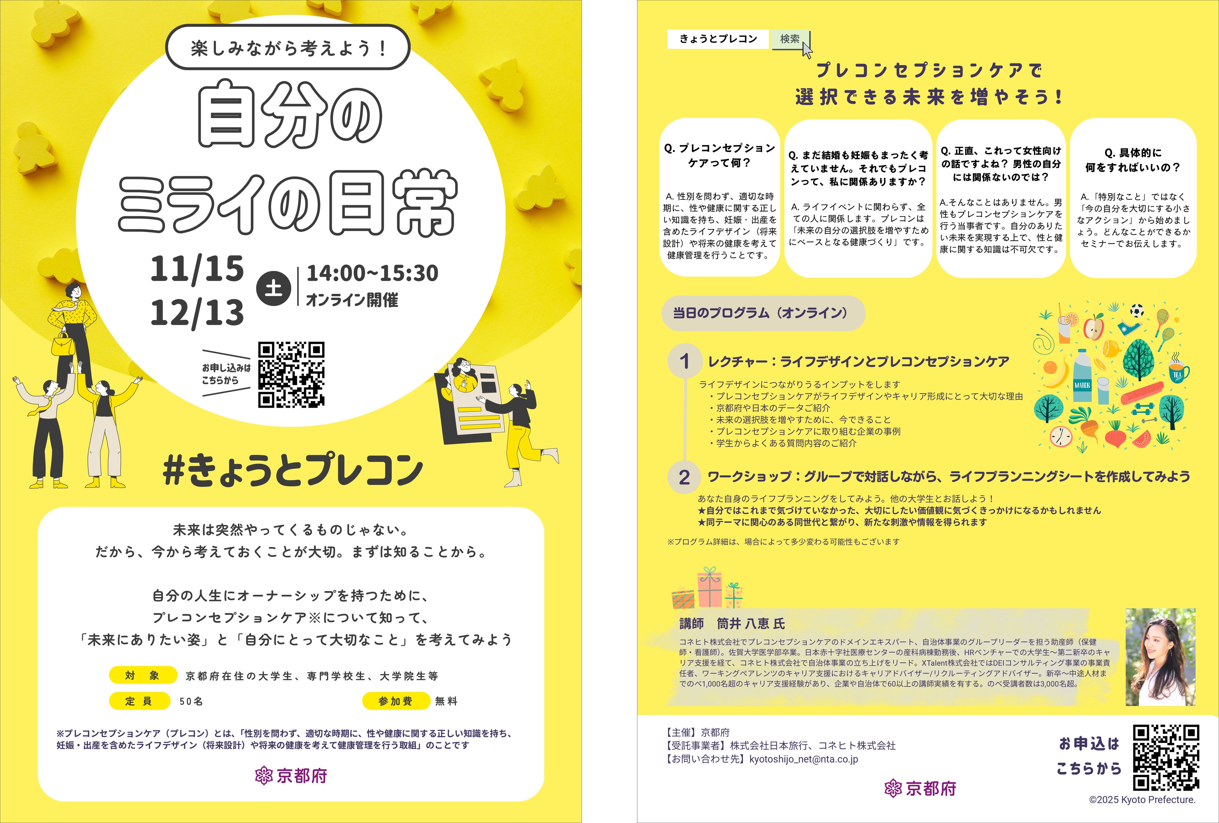 コネヒト株式会社(本社:東京都中央区、代表取締役 杉井信一郎、以下「コネヒト」)は、株式会社 日本旅行(本社:東京都中央区、代表取締役社長 吉田圭吾、以下「日本旅行」)とともに、京都府在住の大学生・専門学校生・大学院生等を対象としたプレコンセプションケアに関するオンラインセミナーを2025年11月15日(土)および12月13日(土)の全2回開催いたします。