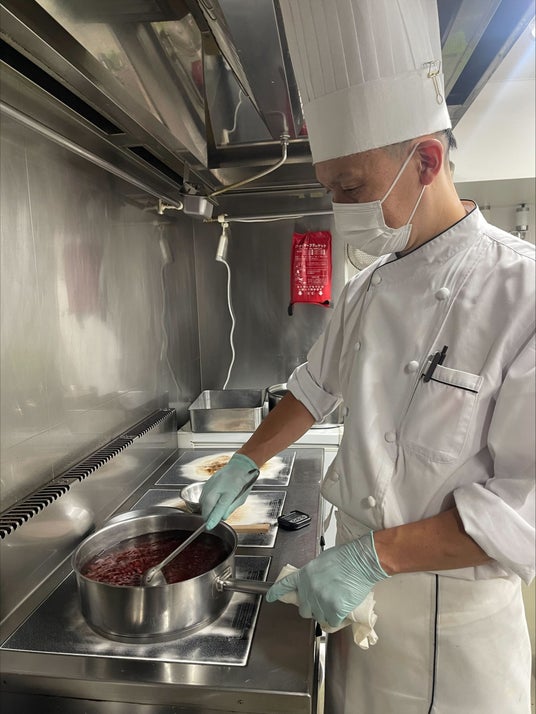 近年、健康志向の高まりや環境への配慮から、「豆」が注目されています。また、インバウンドの間では、日本ならではの食文化を体験したいというニーズが年々高まっています。そこで、当館では、日本人の食に欠かせない存在でありながら、まだ海外のお客様には十分知られていない豆をテーマに、あんこを使ったデザートを提供することにしました。あんこの仕入れを検討する中で、近年、オホーツク地方で小豆の作付面積が増加していることを知りました。当館の支配人が道東出身であることから、これまでにも道東産の食材を取り入れたメニュー展開しており、今回もそのご縁から、オホーツク産小豆を使うことに決めました。当初は、既成のあんこの仕入れを検討していましたが、オホーツク産小豆を使ったあんこは市場にほとんど出回っていないことがわかり、豆の状態で仕入れ、ホテルのキッチンで一から手作りしています。