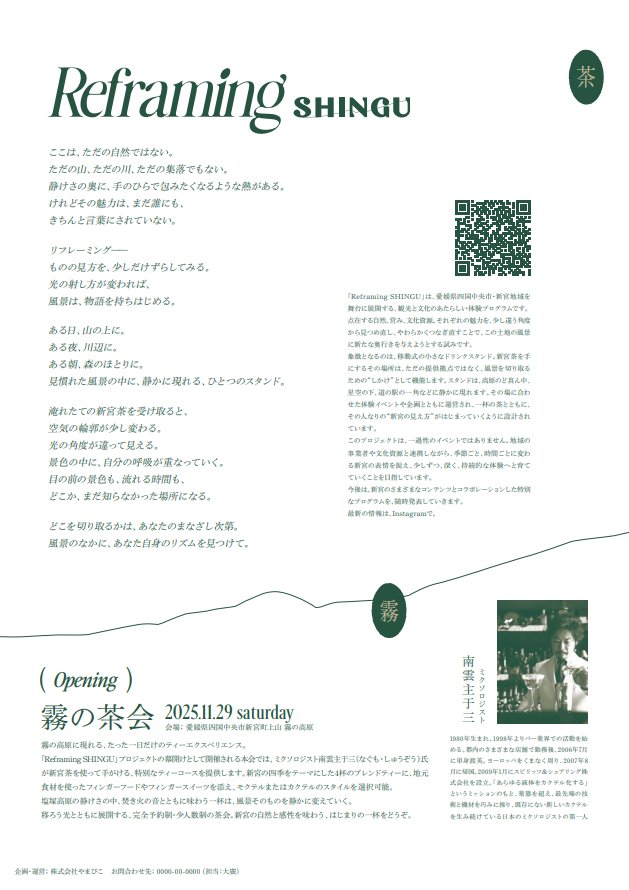 イベント開催に先立ち、報道関係者の皆様を対象とした移動式スタンドのお披露目および「霧の茶会」の先行体験・取材機会となるメディアデーを設けます。「Reframing SHINGU」プロジェクトの目的と今後の展望をご説明。完成した移動式スタンドのお披露目と、コンセプトに合わせた展示、第1弾イベント「霧の茶会」で提供される特別な新宮茶メニューの一部をご試飲。開 催 日 時: 2025年11月26日(水)13:00~15:00