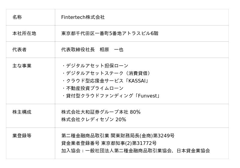 Fintertechは、大和証券グループ及びクレディセゾンがそれぞれ創業来培ってきた金融ビジネスのノウハウを礎としながら、最先端のテクノロジーの活用や外部企業との連携により次世代金融サービスを機動的にかつ柔軟に創出することを目指しています。 主な事業として、暗号資産を活用した「デジタルアセット担保ローン」及び「デジタルアセットステーク(消費貸借)」、クラウド型応援金サービスの「KASSAI」、「未来をわかちあう投資」を提供する貸付型クラウドファンディングサービス「Funvest(ファンベスト)」を展開しています。