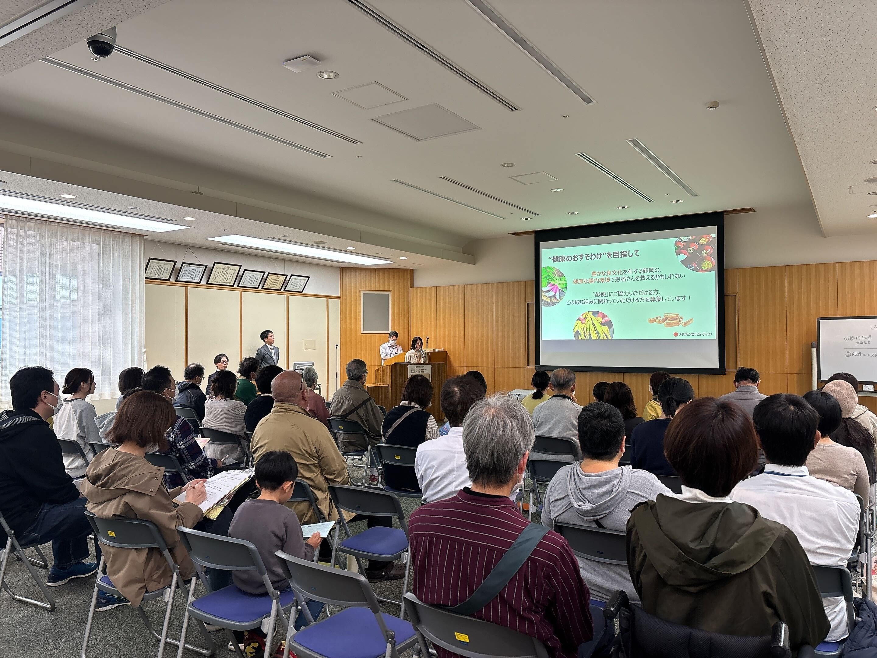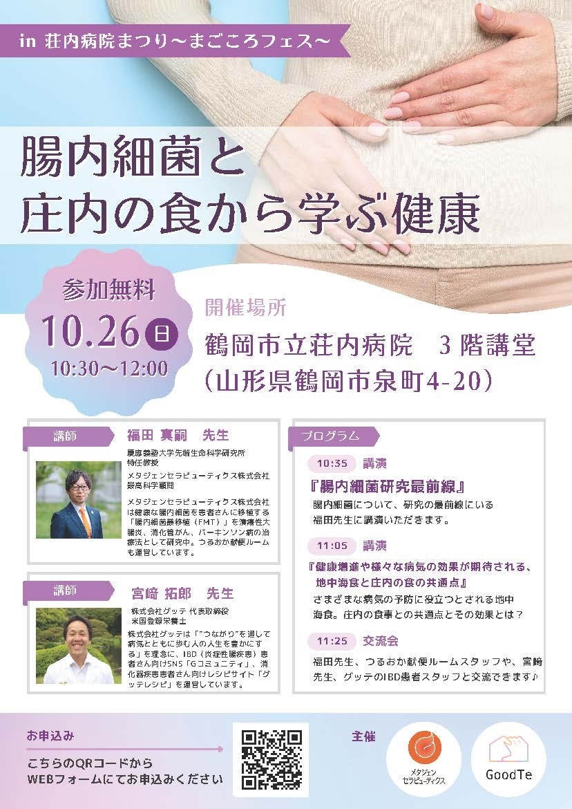 メタジェンセラピューティクス株式会社(本社:山形県鶴岡市、代表取締役社長CEO:中原拓)は、2025年10月26日、山形県鶴岡市で開催された鶴岡市立荘内病院主催のイベント「荘内病院まつり」内で、株式会社グッテ(本社:東京都千代田区、代表取締役:宮崎拓郎)と共催で「腸内細菌と庄内の食から学ぶ健康」と題した講演会・交流会を開催しました。