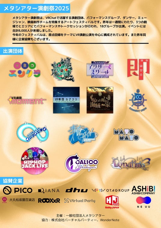 昨年は3劇場+複数ワールドで18団体が参加し、延べ8,000人が来場。演劇・ダンス・即興・音楽・ライブまで、“舞台”の定義を拡張する試みに、国内外のVRファンが熱狂しました。2025年は原点回帰をテーマに、より深く、より自由なパフォーマンス体験を提供します。