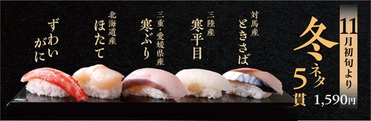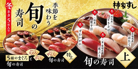 冬の旬ネタを使った寿司は、「旬のネタ5貫盛り」の他にも、まぐろやいくらなどの定番ネタが入った「旬の寿司 上」や、中とろや生うにが入った「旬の寿司 特上」、まぐろ・中とろ・ねぎとろ巻きが入った「旬とまぐろの寿司」、さらに今年の冬は、まぐろが堪能できる「5種のまぐろと旬の寿司」など、盛り込みを多数ご用意しております。