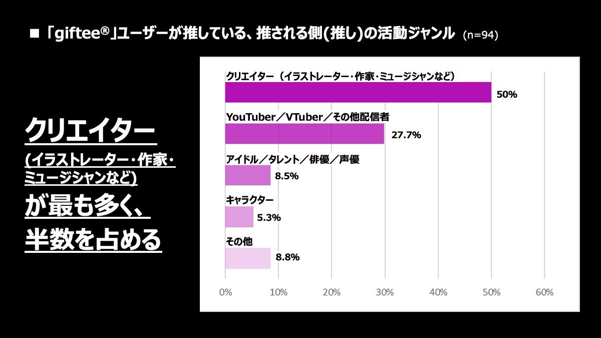 - 回答者のうち、「推される側」の活動内容やジャンルは、「クリエイター(イラストレーター・作家・ミュージシャンなど)」が最多の50%。YouTuber/VTuberなどの配信者が約28%と続いた