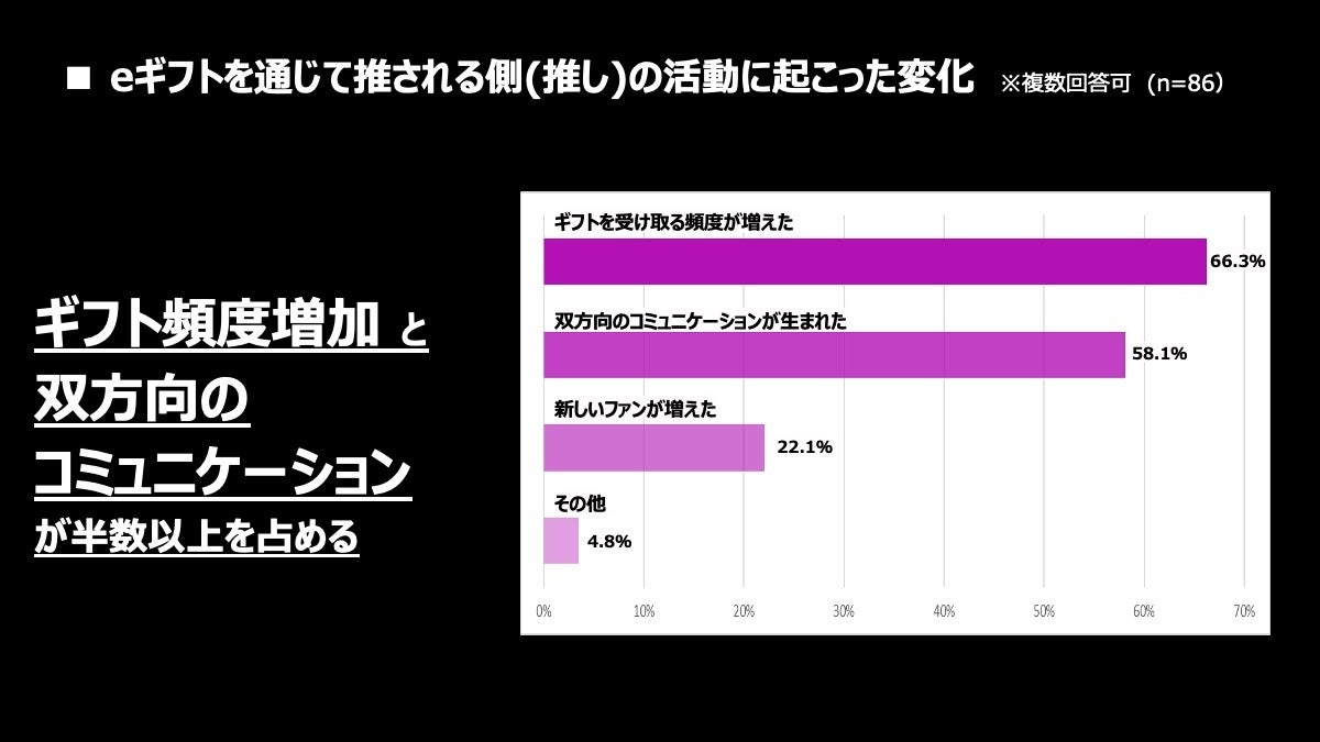 特に推される側(推し)への調査では、ファンからeギフトを受け取ることによって、eギフトに限らずギフトそのものの受け取り頻度が高くなる、また、ファンとの心の距離が近くなったという声が多く、SNSやDMなどでファンへお礼のリアクションをする傾向が顕著になりました。