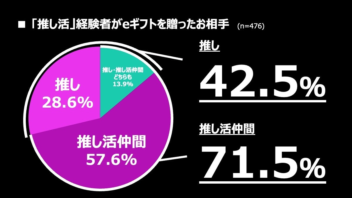 - eギフトの贈り先は「推し活仲間」が約57%、「推し」が約29%、「推しと推し活仲間の両方」と回答した方が約14%