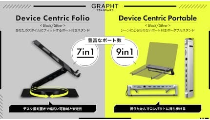 MSYは11月7日、「好きを語れる人を増やす」のGRAPHTブランドから、「GRAPHT STANDARD」シリーズのポート付きノートPCスタンド「Device Centric Folio」「Device Centric Portable」の2製品をGRAPHT公式ECサイト、全国の家電量販店・PC専門店で発売する。予約受付中。