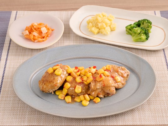 副菜は、ベーコンの旨みがアクセントのにんじんソテー、まろやかなホワイトソースで仕上げたさつまいものクリーム和え、さっぱりとしたブロッコリーコンソメです。