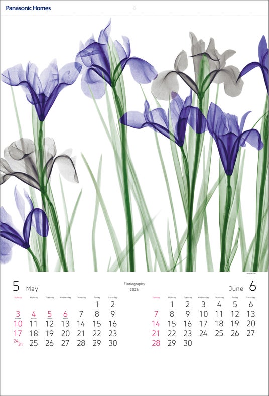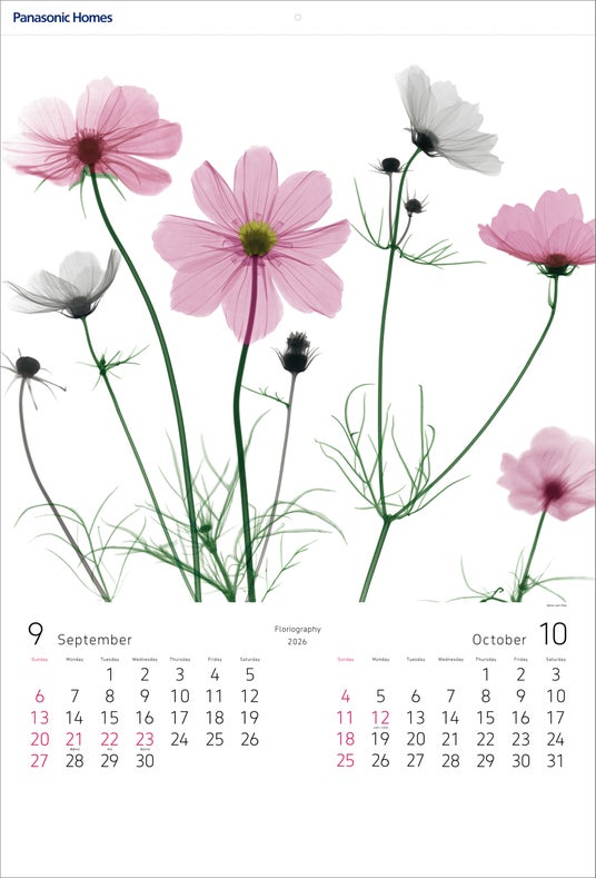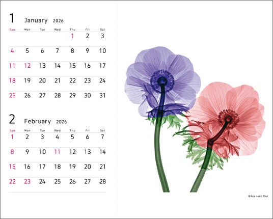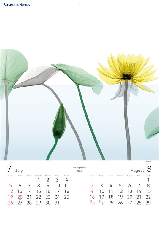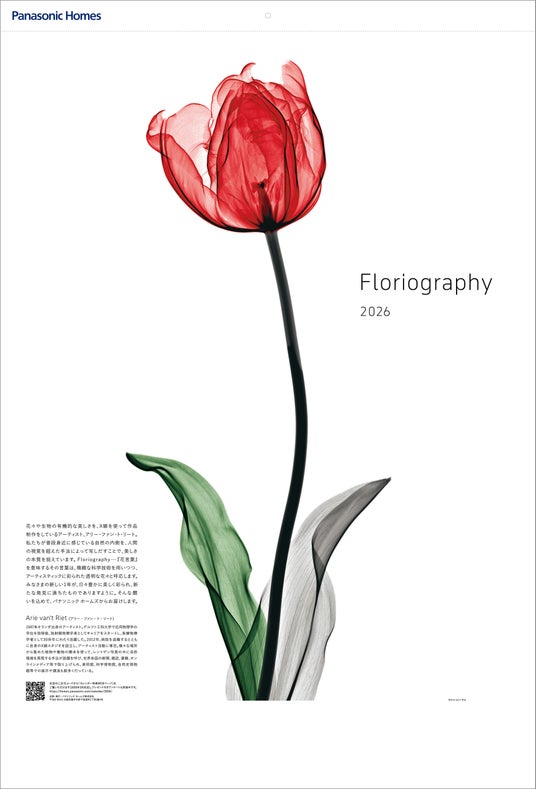 2026年版 パナソニック ホームズカレンダー『Floriography/アリー・ファン・ト・リート作品集は、オランダ出身のアーティスト、アリー・ファン・ト・リート氏の作品を起用しました。アリー氏の作品は、身近にある花々をモチーフに、X線を使ったレントゲン写真で構成されています。透過する光によって浮かび上がる花の内面に、本質的な美しさや生命のきらめきが感じられる作品を7点収録しました。