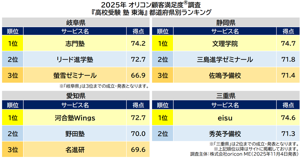 『高校受験 塾 東海』都道府県別ランキング(2025年 オリコン顧客満足度(R)調査)