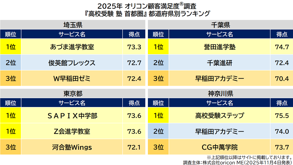 『高校受験 塾 首都圏』都道府県別ランキング(2025年 オリコン顧客満足度(R)調査)