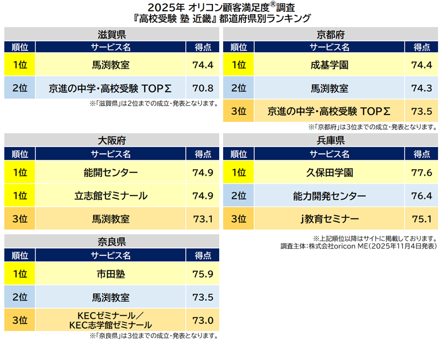 『高校受験 塾 近畿』都道府県別ランキング(2025年 オリコン顧客満足度(R)調査)