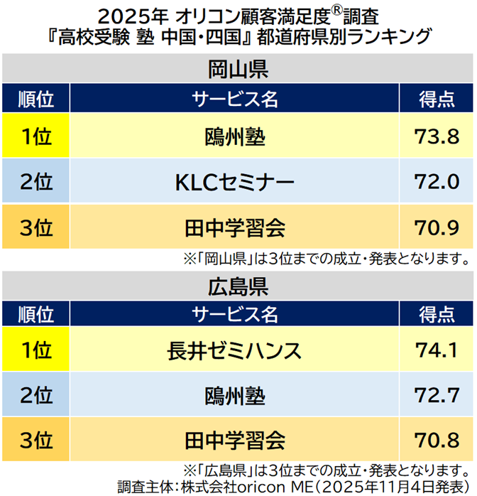 『高校受験 塾 中国・四国』都道府県別ランキング(2025年 オリコン顧客満足度(R)調査)