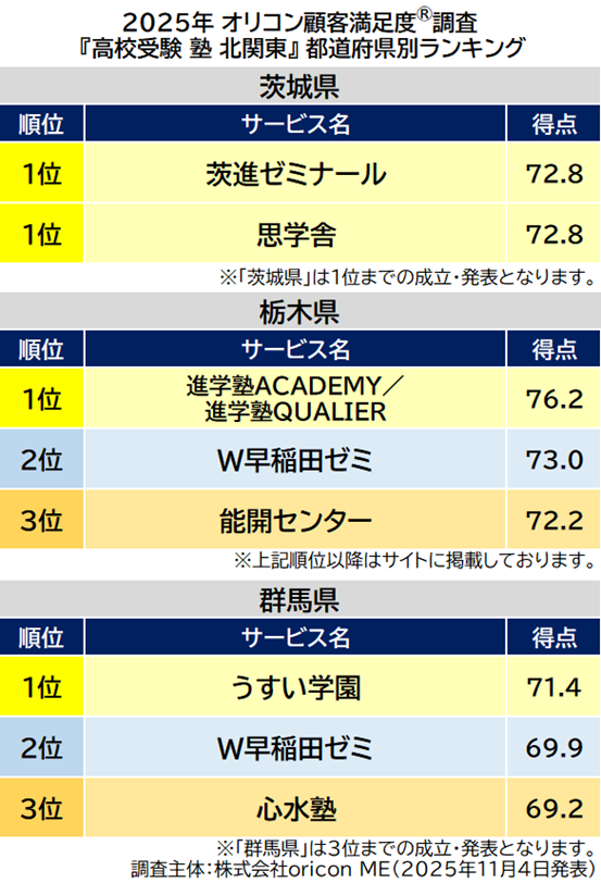 『高校受験 塾 北関東』都道府県別ランキング(2025年 オリコン顧客満足度(R)調査)