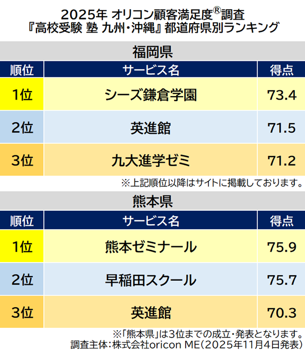 『高校受験 塾 九州・沖縄』都道府県別ランキング(2025年 オリコン顧客満足度(R)調査)