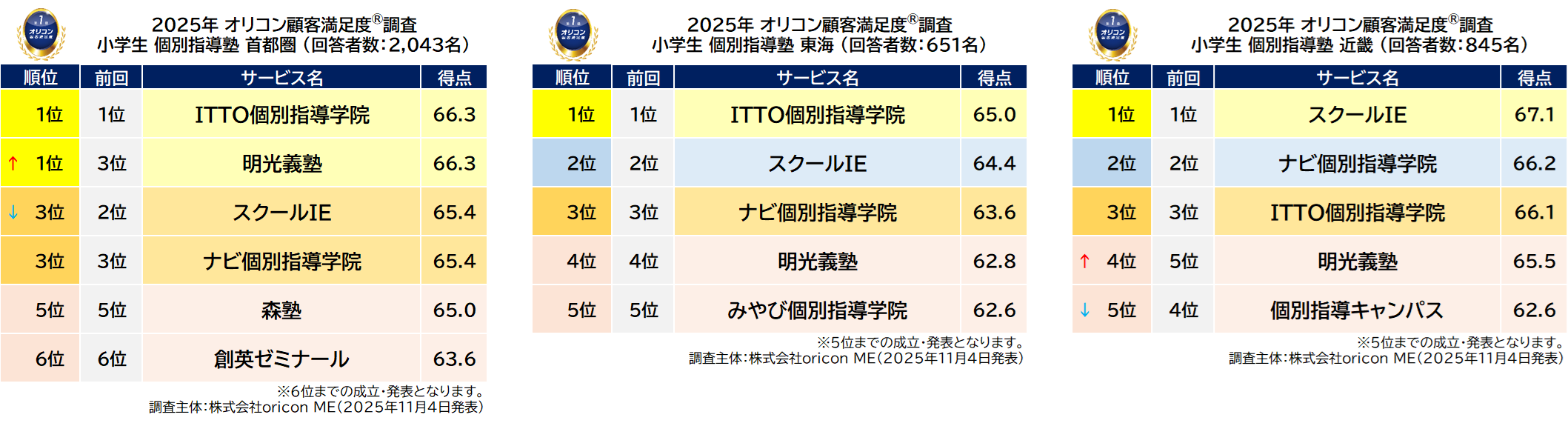 【ITTO個別指導学院】が3年連続の総合1位、【明光義塾】が調査開始以来、初の総合1位に
