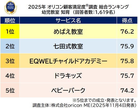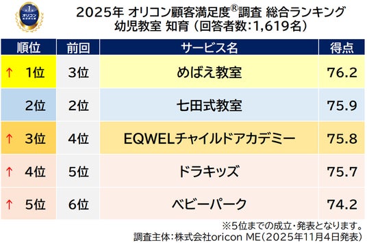 『幼児教室 知育』総合ランキング(2025年 オリコン顧客満足度(R)調査)