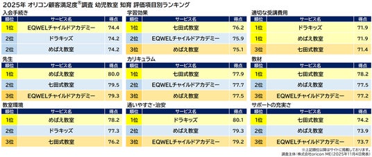 『幼児教室 知育』評価項目別ランキング(2025年 オリコン顧客満足度(R)調査)