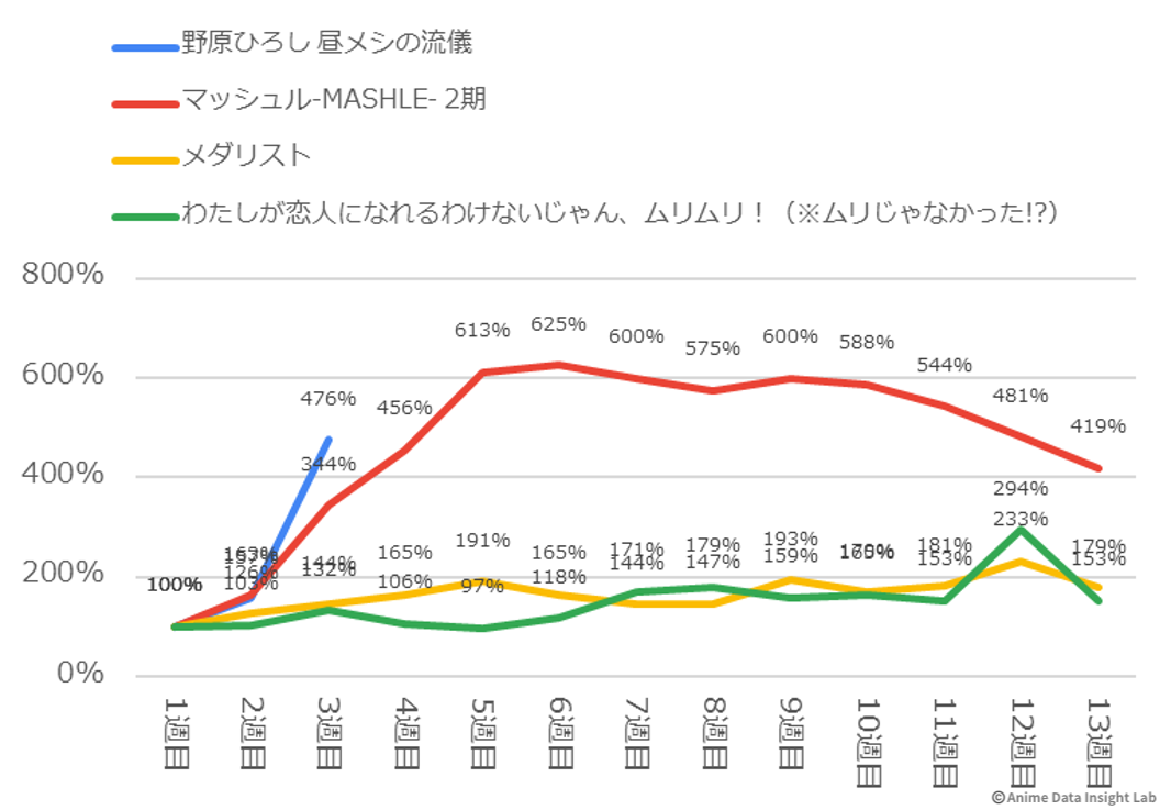 今季最大のサプライズは『野原ひろし 昼メシの流儀』の450%という過去最高の伸びだ。初週は控えめなスタートだったが、3週目には急上昇し、初週比4.5倍という数値を記録した。SNSでの口コミ効果が徐々に広がり、「クレヨンしんちゃん」の人気キャラクターを主人公にしたスピンオフ作品への注目が加速度的に高まっていることがわかる。