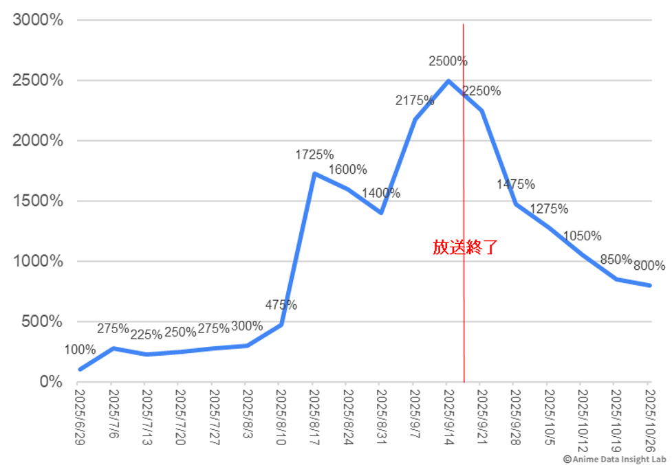『銀河特急 ミルキー☆サブウェイ』はさらに劇的で、8週目に1725%という驚異的な伸びを記録。TikTokで特定のシーンやセリフ、楽曲が繰り返し拡散され、一部ではミーム化した。その結果、放送終了後も継続的に高い数値を維持している。