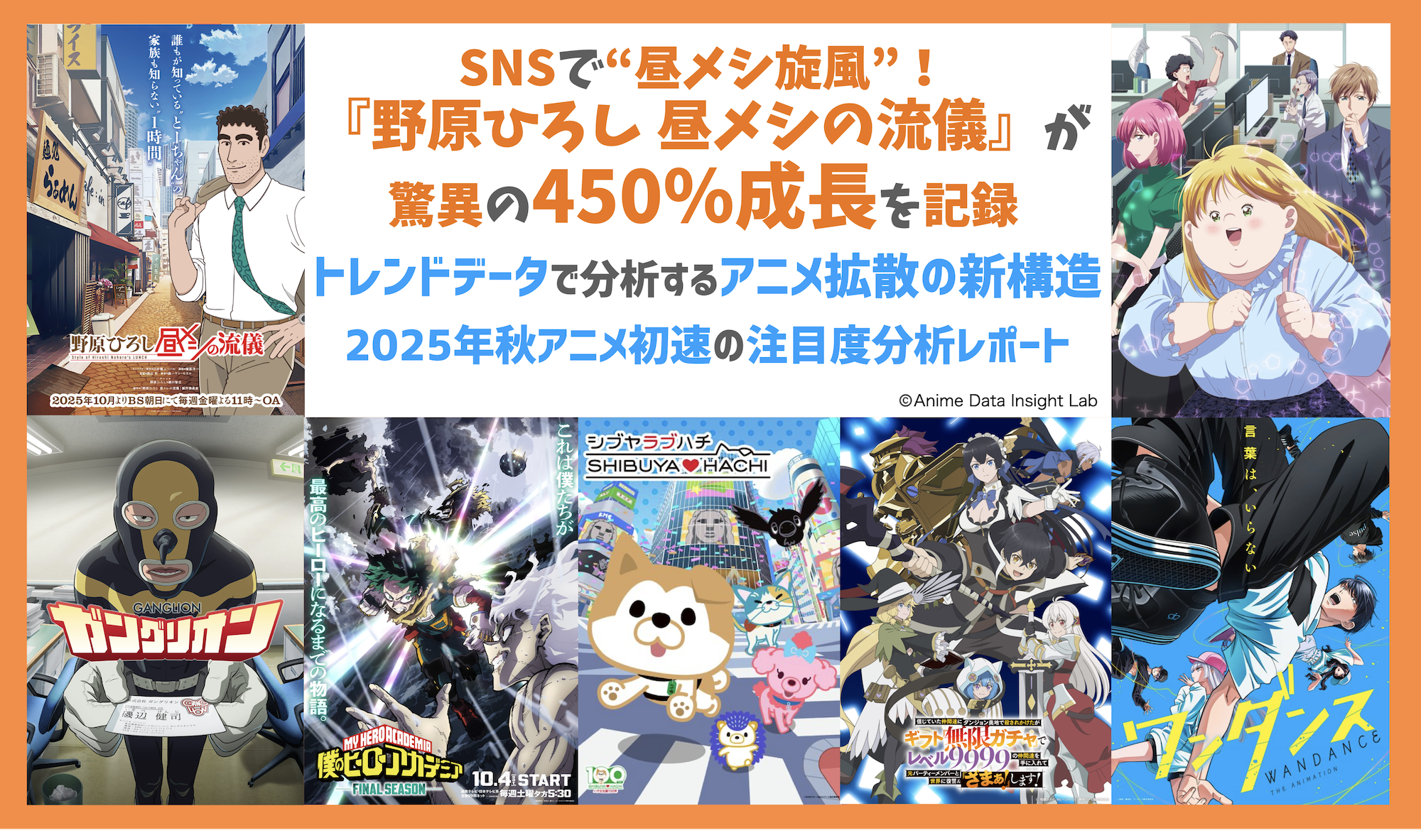 本記事では、Googleトレンドによる検索量データとX投稿量データを用いて、放送開始から3週間の初速データから、今季の注目作品と視聴者行動の特徴を分析する。特に注目すべきは、初動では目立たなかった『野原ひろし 昼メシの流儀』が3週目にトレンドスコア450%という驚異的な伸びを記録した点だ。