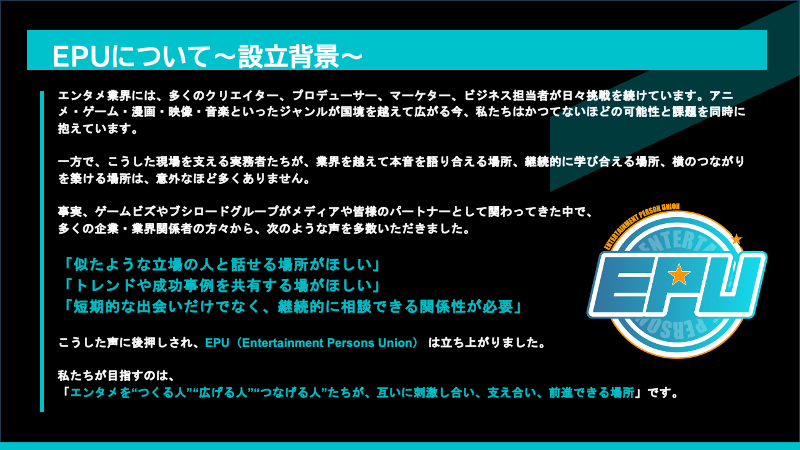 EPU(Entertainment Persons Union) は「エンタメを“つくる人”“広げる人”“つなげる人”たちが、互いに刺激し合い、支え合い、前進できる場所」として開設されたエンタメビジネスコミュニティです。