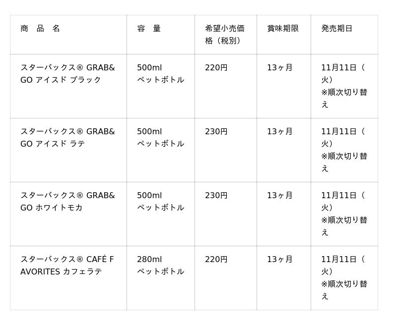 スターバックス・コーポレーション(本社:米国 シアトル、CEO:ブライアン・ニコル)と、サントリー食品インターナショナル株式会社(本社:東京都、社長:小野真紀子)は、ご好評いただいているペットボトル入りコーヒーシリーズの4種「スターバックス(R) GRAB&GO(グラブ アンド ゴー) アイスド ブラック」、「同 アイスド ラテ」「同 ホワイトモカ」および「スターバックス(R) CAFE FAVORITES(カフェ フェイバリット) カフェラテ」のホリデーシーズン※限定パッケージを、11月11日(火)から全国のセブン-イレブンで順次切り替え発売します。