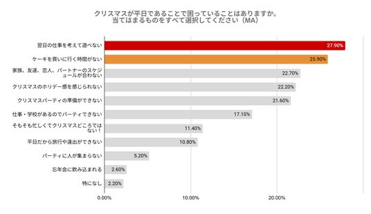 - クリスマスが平日であることの悩みは、「翌日の仕事のことを考えて遊べない」「ケーキを買いにいく時間がない」がTOP。「家族・友達・恋人・パートナーと予定が合わせられない」が続く結果に