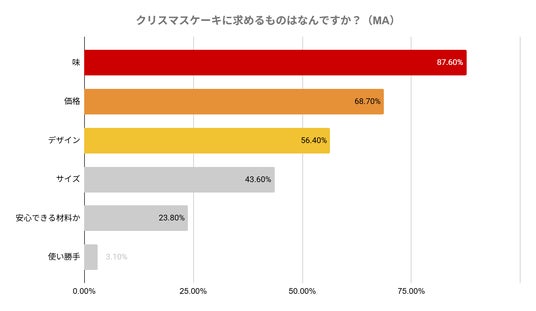 - クリスマスケーキに求めるものは「味」約87%に次いで「価格」が約68%。「デザイン」よりも重視。