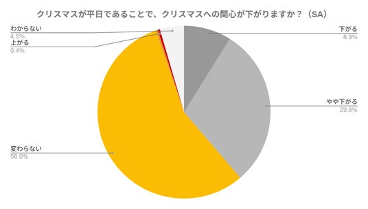 - クリスマスが平日なことで関心は「変わらない」が半数以上。一方、約38%が「下がる」と回答