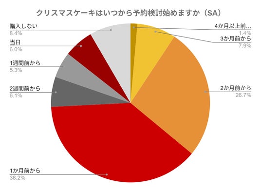 - クリスマスケーキ購入検討は「1ヶ月前から」が約38%とスタンダードに。「2か月前から」検討する人も約26%と多く、「当日」は約6%とごく少数。