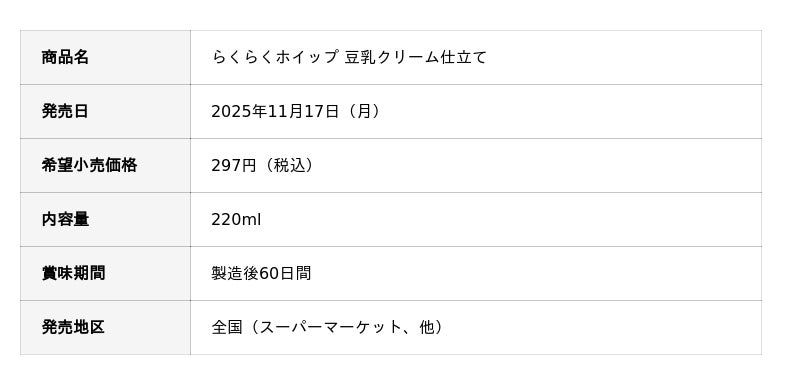 トーラク株式会社(本社:兵庫県神戸市東灘区向洋町西5丁目5番、代表取締役社長:毛利 功一郎)は、「らくらくホイップ 豆乳クリーム仕立て」 を2025年11月17日(月)より全国発売いたします。