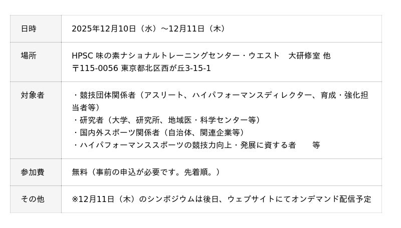 日本スポーツ振興センター(JSC:JAPAN SPORT COUNCIL)が管理・運営するハイパフォーマンススポーツセンター(HPSC:JAPAN HIGH PERFORMANCE SPORT CENTER)において、12月10日(水)~12月11日(木)にJSCが開催する『ハイパフォーマンススポーツ・カンファレンス2025』のセッション内容が決定し、本日から参加申込受付を開始しましたのでお知らせいたします。