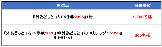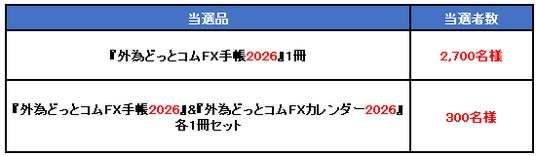 対象期間中にエントリーのうえ所定のクイズに正解され、かつ『外貨ネクストネオ』にて1回以上の新規取引をされた方の中から抽選で合計3,000名様に、『外為どっとコムFX手帳2026』1冊、または同手帳&『外為どっとコムFXカレンダー2026』各1冊セットを進呈いたします。さらに、同期間中に『CFDネクスト』にて1回以上の新規取引をされると当選確率が3倍になります!!