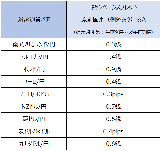 キャンペーンスプレッド掲示時間帯:対象期間中の各営業日午前9時~翌午前3時