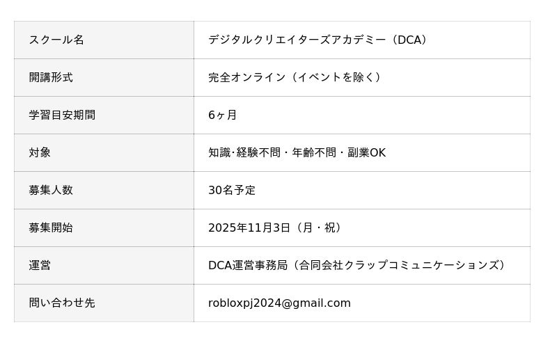 2025年11月、合同会社クラップコミュニケーションズ(本社:東京都港区、代表取締役社長:蔵田 郁子)は、ゲーム版YouTubeとして注目を集める「Roblox」のプロクリエイターを育成するオンラインスクール<デジタルクリエイターズアカデミー(以下、DCA)>を開校。生徒募集を開始したことをお知らせいたします。