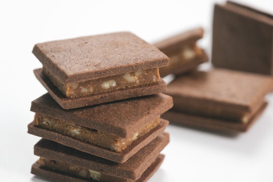 本商品は、生クリームときび糖を煮詰めたキャラメルヌガーに、香ばしいくるみを加えココアクッキーでサンドしています。キャラメルのねっちりとした食感をあえて抑え、サクッと歯切れのよいキャラメルに仕上げた新感覚スイーツです。