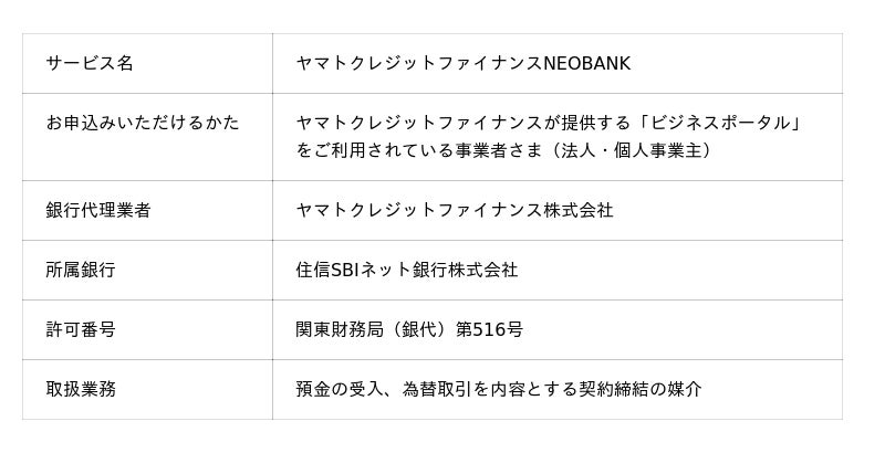 ヤマトクレジットファイナンスが提供する各種サービスをご利用の事業者さま向けに、住信SBIネット銀行が提供する銀行サービスです。