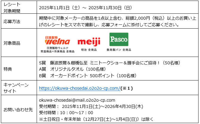 本キャンペーンは、藤波辰爾さん、新日本プロレス・棚橋弘至さんとのタイアップ企画で、オークワが和歌山県を中心に近畿・東海地方に展開する「オークワ」「スーパーセンターオークワ」「パレマルシェ」「プライスカット」などの各店舗で、対象商品をご購入の方にご応募いただけます。ご応募いただいた方の中から抽選でミニトークショー&握手会へのご招待のほか、オリジナルタオル等の賞品も当たります。