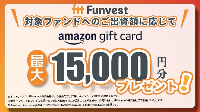 本ファンドへ出資していただいた投資家の皆様を対象として、出資額に応じて最大15,000円分のAmazonギフトカードをプレゼントするキャンペーンも併せて実施いたします。