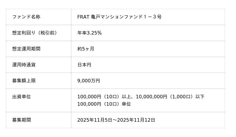 「未来をわかちあう投資」を提供する「Funvest(ファンベスト)」(以下、Funvest)は、「FRAT 亀戸マンションファンド1-3号」(以下、本ファンド)の募集を11/5より開始しますので、お知らせいたします。