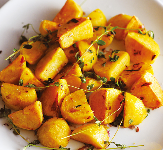 2.フライパンに油(豚、鴨の脂があればよいが、なければピュアオリーブオイルなど)を大さじ1を入れる。じゃがいもを入れて中弱火で焼きつけるようにゆっくりと焼く。じゃがいもがすき通ってきたら、タイム、エシャロットのみじん切り(なければほかのもので代用せずに省略でよい)を加えてこんがりと焼き色がつくまでさらに焼く。仕上げに塩をしっかりめにふる。