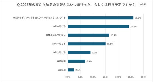 また、今年は気温の上下が激しく、季節の変化が読みにくかったことから、「2025年の夏から秋冬の衣替えはいつ頃行った、もしくは行う予定ですか?」については、「特に決めず、常に出し入れできるようにしている」(26.0%)が最多の回答となり、衣替えの負担を少しでも軽減したいと思う傾向があることが伺えます。